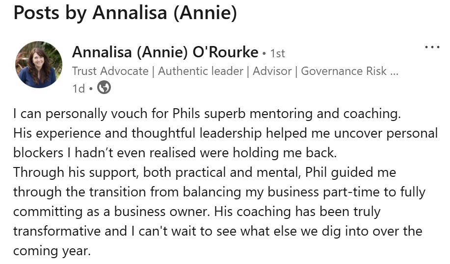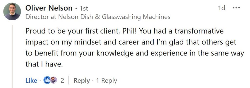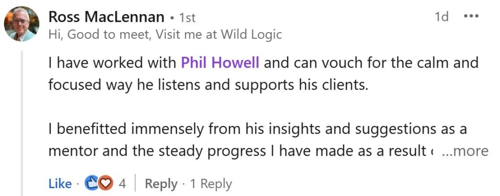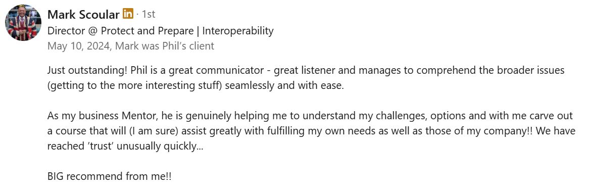 “You seemed to understand my business and were able to read my body language re the areas of my business which I find most interesting and would like to develop. You gave me some clear actions to complete to progress my skills and e.g. Linkedin knowledge. I think it added value by pinpointing issues to focus on.“